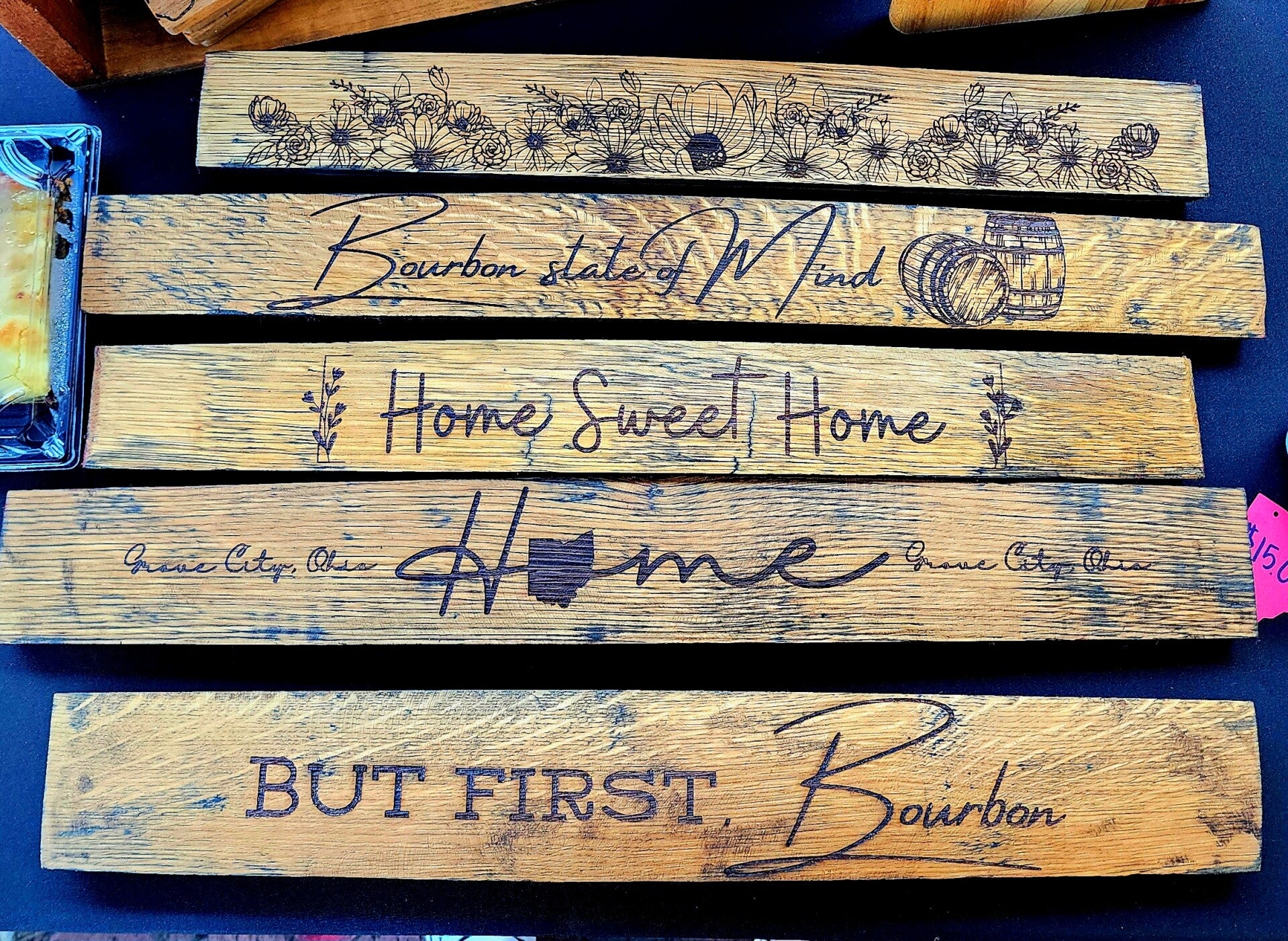 A beautiful engraved bourbon stave to put on a desk, bar, Window ledge or fire place mantle.