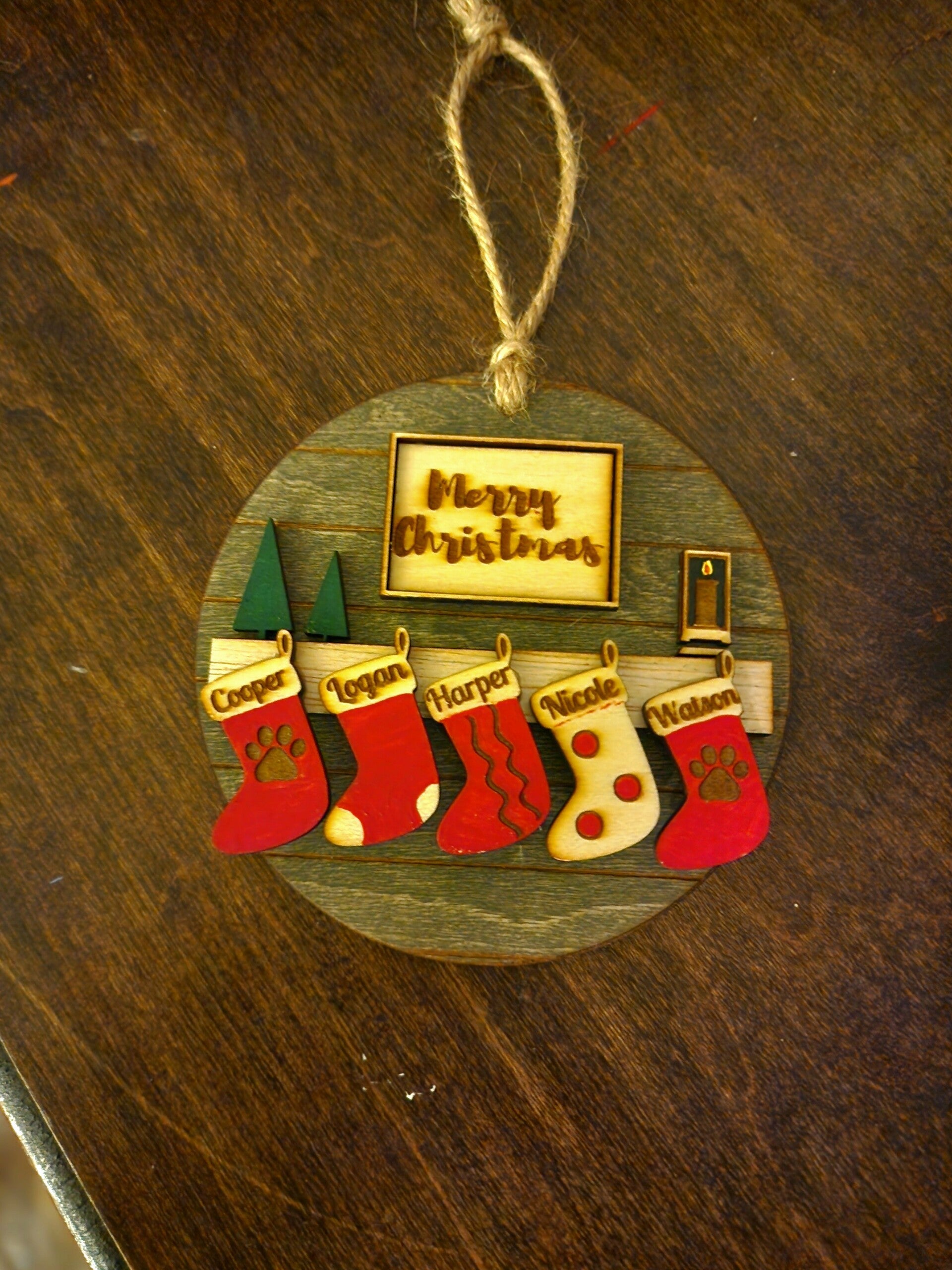 Customized family mantle ornament. 2-10 family members, friends, or pets can have their own stocking.